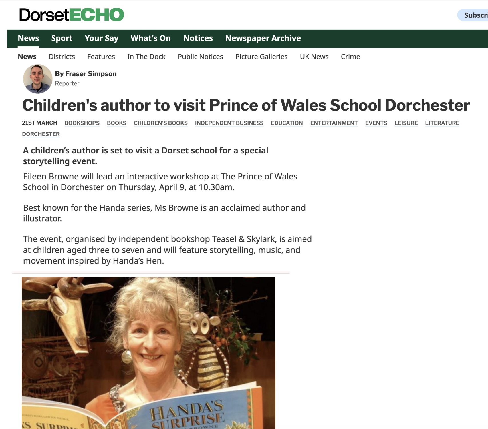 We are thrilled that legendary children’s author and illustrator, Eileen Browne, is coming to Dorchester to host a music, movement, and storytelling workshop based on her beloved ‘Handa’ series of books.